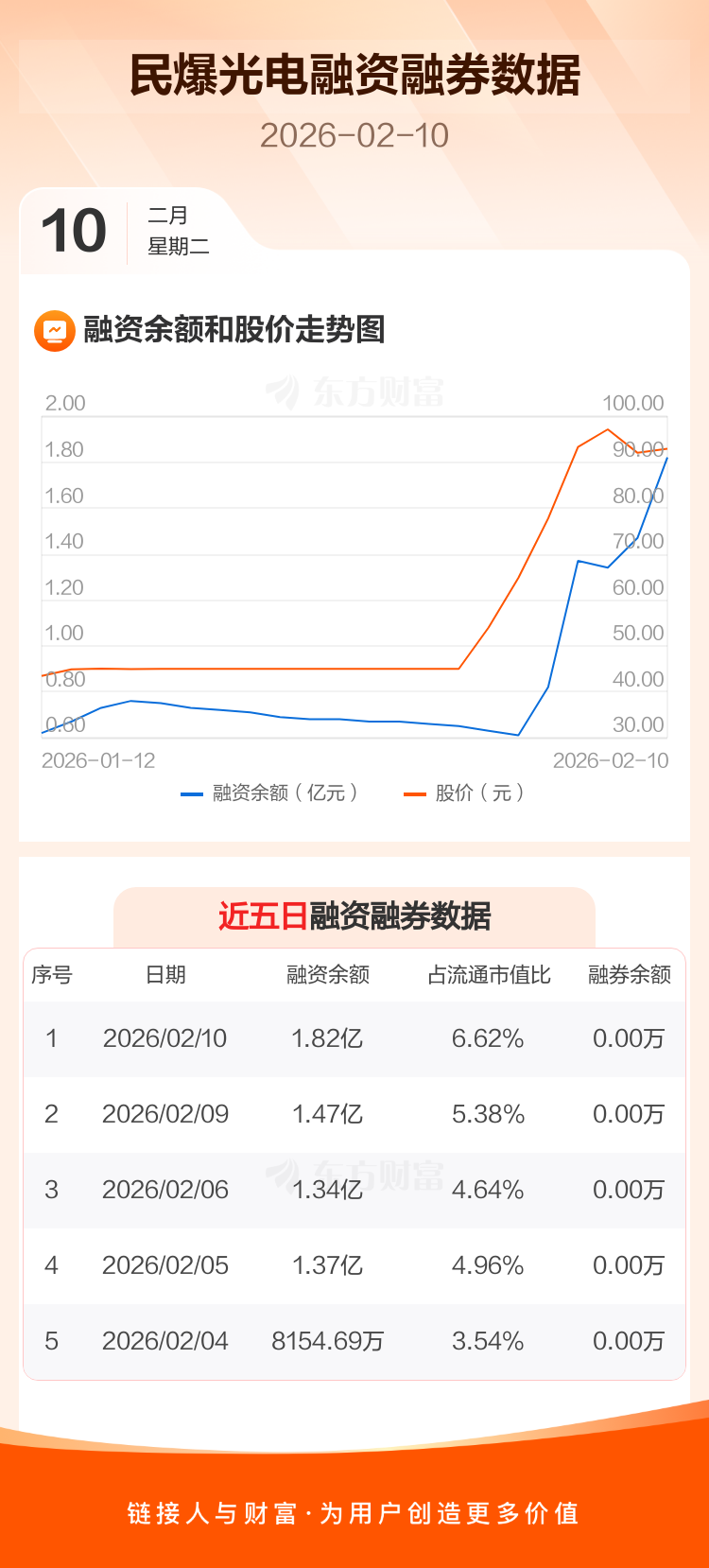 交易所最新数据显示,民爆光电于2026年2月10日获融资买入1.19亿元,融资偿还8311.52万元,当日融资净买入3556.49万元。目前,该股融资余额1.82亿,占流通市值比例为6.62%。