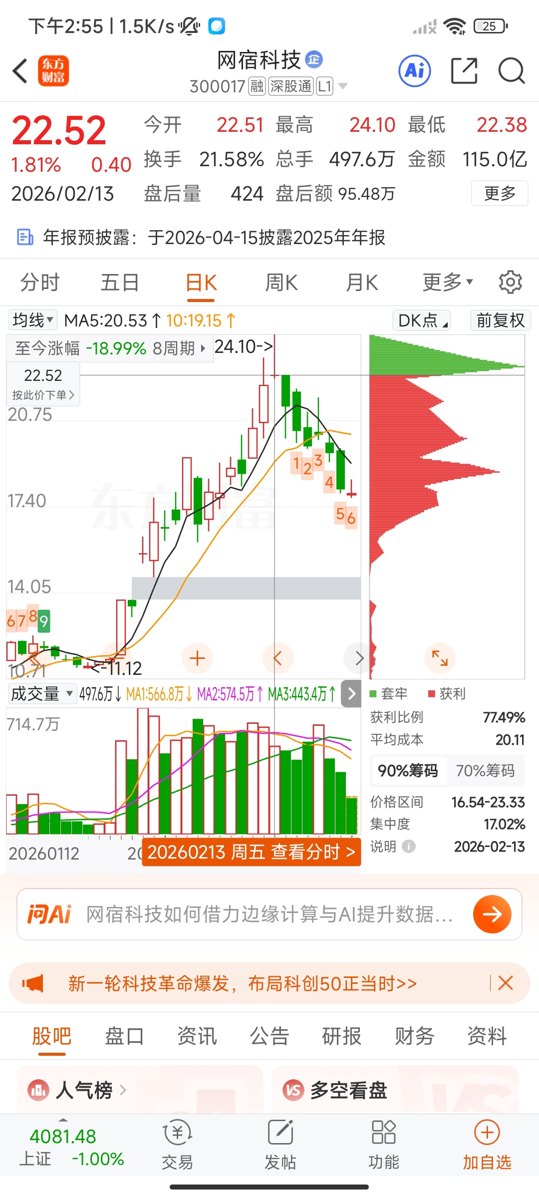 参考网宿科技2月13日那天,几乎一样的走势,而且前三天量能的比例也是一样的,隔天