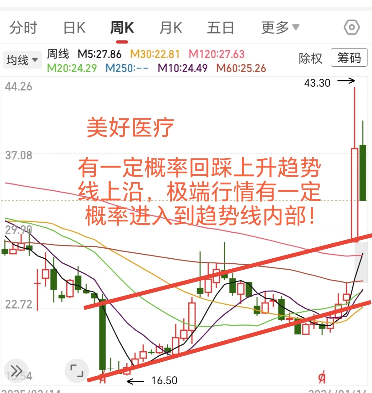 美好医疗的第一目标价位大概是43.2 波动上沿45.5 波动下沿40.9 根据我的理论预测可知美好医疗的第一目标价位已经实现,最高43.3 与我预测的目标价位43.2仅仅只差一毛钱!所以最近的回落很好理解了吧?接下来的可能走势在趋势途中,这里在回踩趋势线上沿的过程中或是反抽,也就是下跌中继,大家一定注意!