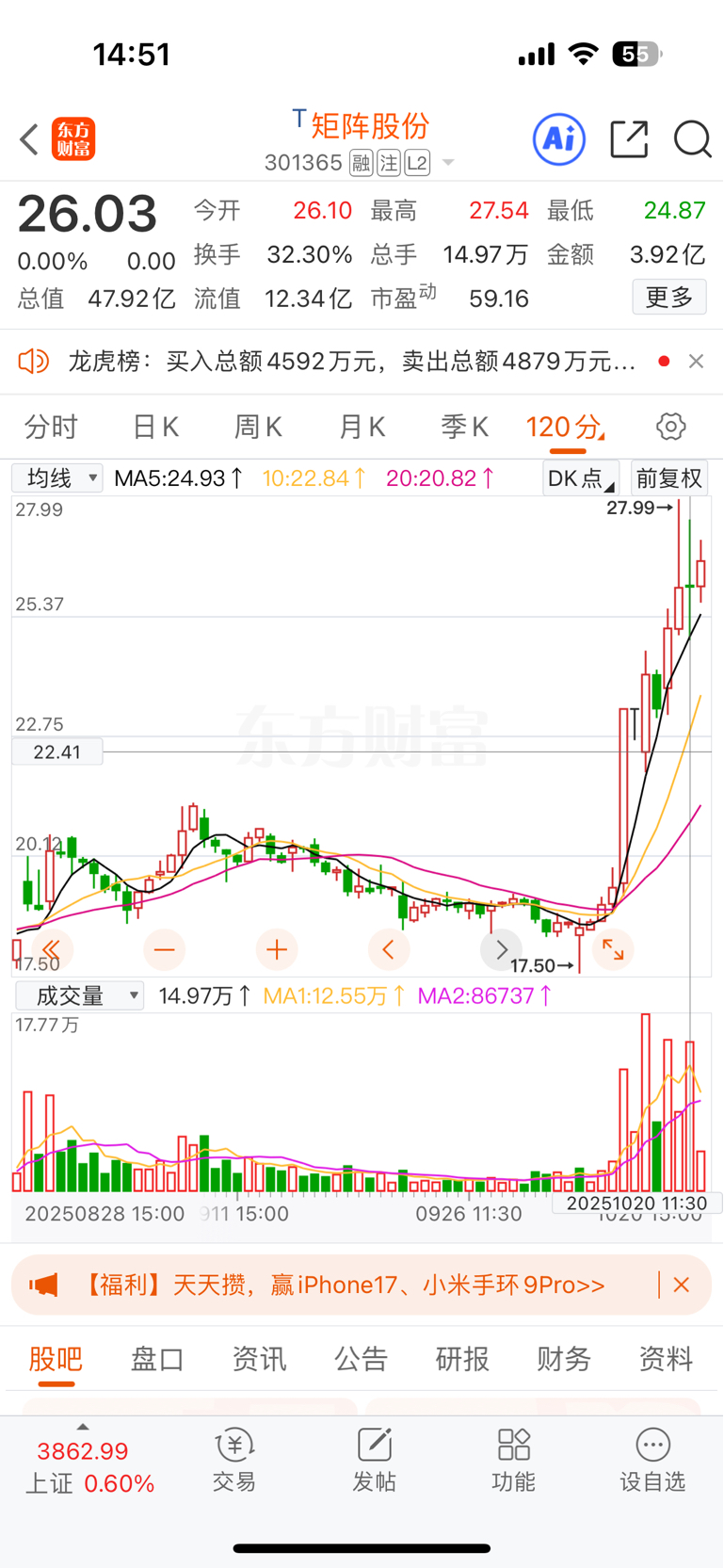 $矩阵股份(SZ301365)$ 120分线看,也算带量滞涨信号了。尾盘又给你拉了点,发套子。快跑。