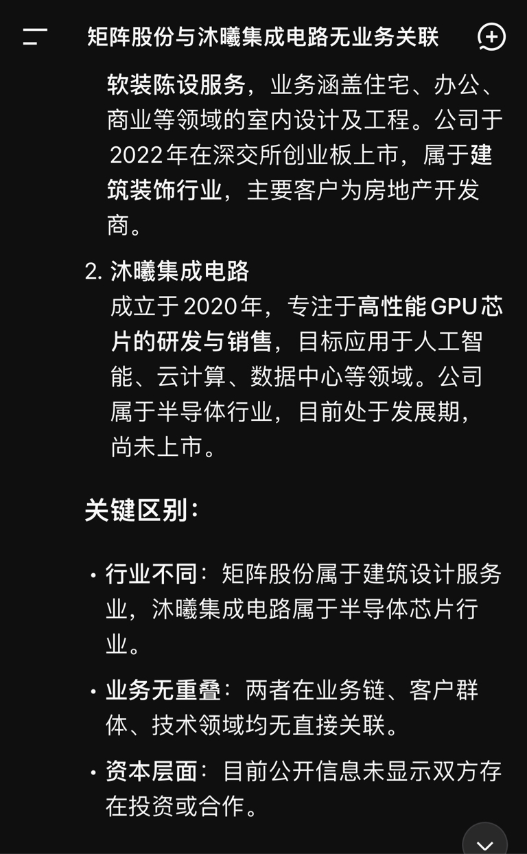$矩阵股份(SZ301365)$ 矩阵和沐曦集成电路根本就没一点关系 AI都被污染了 官网也没关系 这帮tuo...开始造谣了