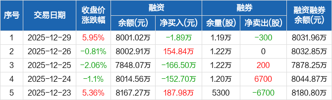 矩阵股份:融资净偿还1.89万元,融资余额8001.02万元(12-29)