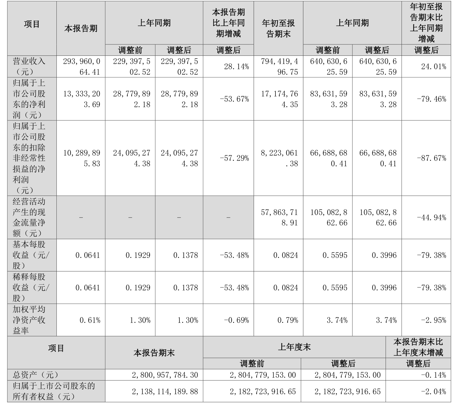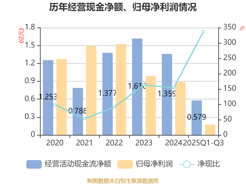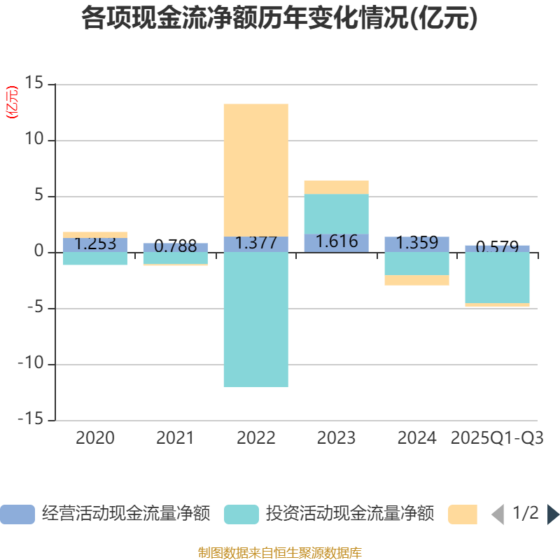 2025年前三季度,公司经营活动现金流净额为5786.37万元,同比下降44.94%;筹资活动现金流净额-3102.63万元,同比增加1.17亿元;投资活动现金流净额-4.57亿元,上年同期为-5.8亿元。