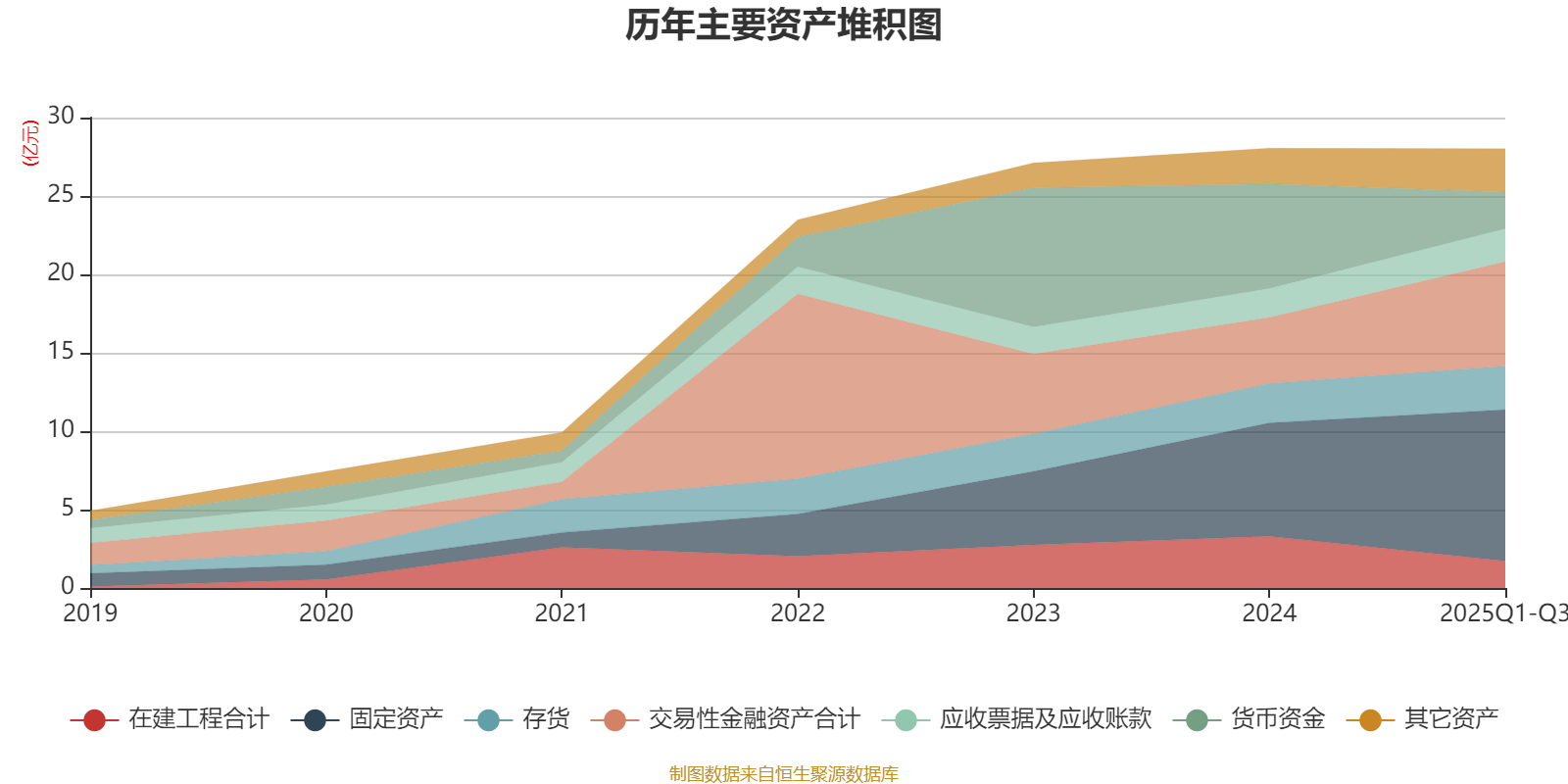 资产重大变化方面,截至2025年三季度末,公司货币资金较上年末减少64.65%,占公司总资产比重下降15.35个百分点;交易性金融资产合计较上年末增加58.68%,占公司总资产比重上升8.81个百分点;固定资产较上年末增加33.41%,占公司总资产比重上升8.67个百分点;在建工程合计较上年末减少47.77%,占公司总资产比重下降5.6个百分点。