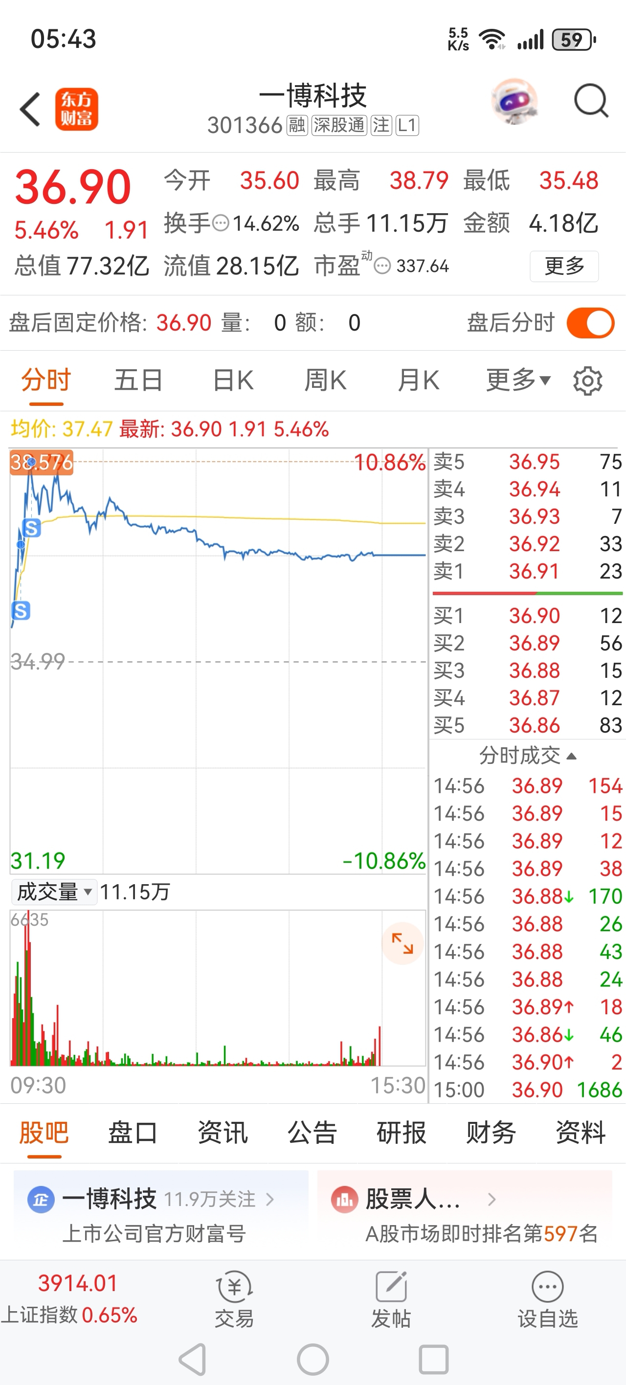 $一博科技(SZ301366)$ 按以往经验,今天没买回卖出的,明天估计有低开能买回。希望明天直接高开高走