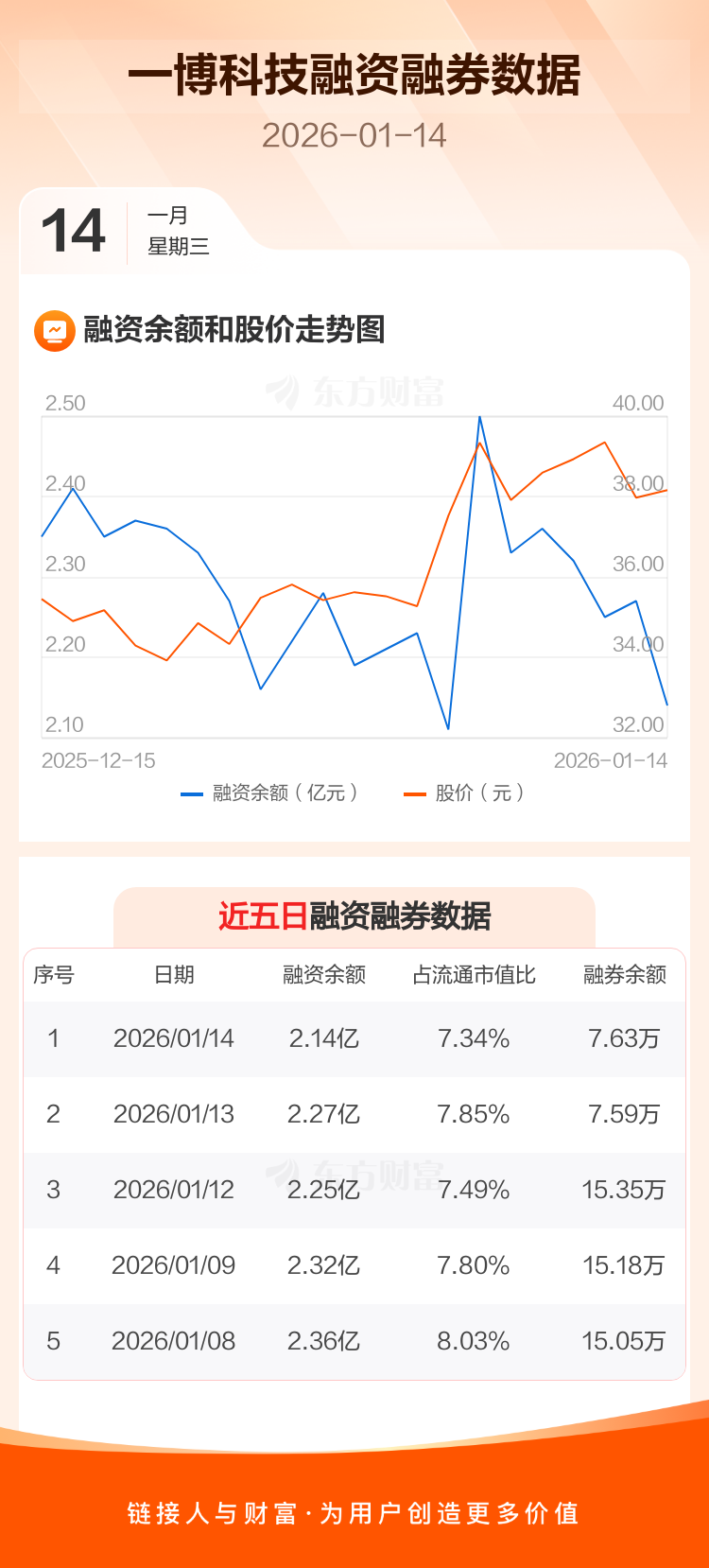 交易所最新数据显示,一博科技于2026年1月14日获融资买入2600.42万元,融资偿还3949.65万元,当日融资净偿还1349.23万元。目前,该股融资余额2.14亿,占流通市值比例为7.34%。