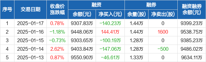 怡和嘉业:融资净偿还140.23万元,融资余额9307.83万元(01-17)