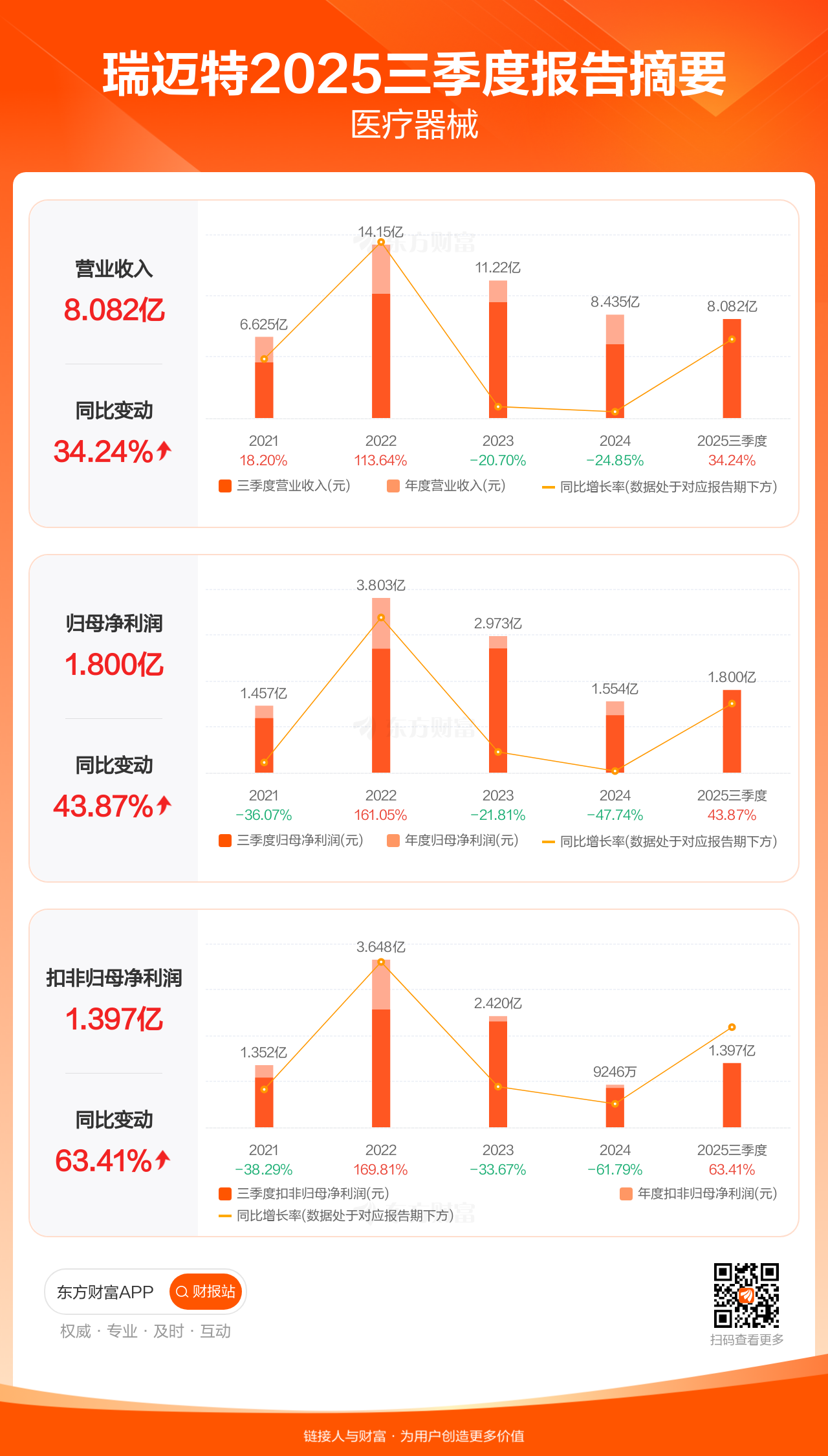 瑞迈特10月28日发布2025年三季报显示,公司前三季实现营业收入8.08亿元,同比增长34.24%;归母净利润1.80亿元,同比增长43.87%;扣非归母净利润1.40亿元,同比增长63.41%。