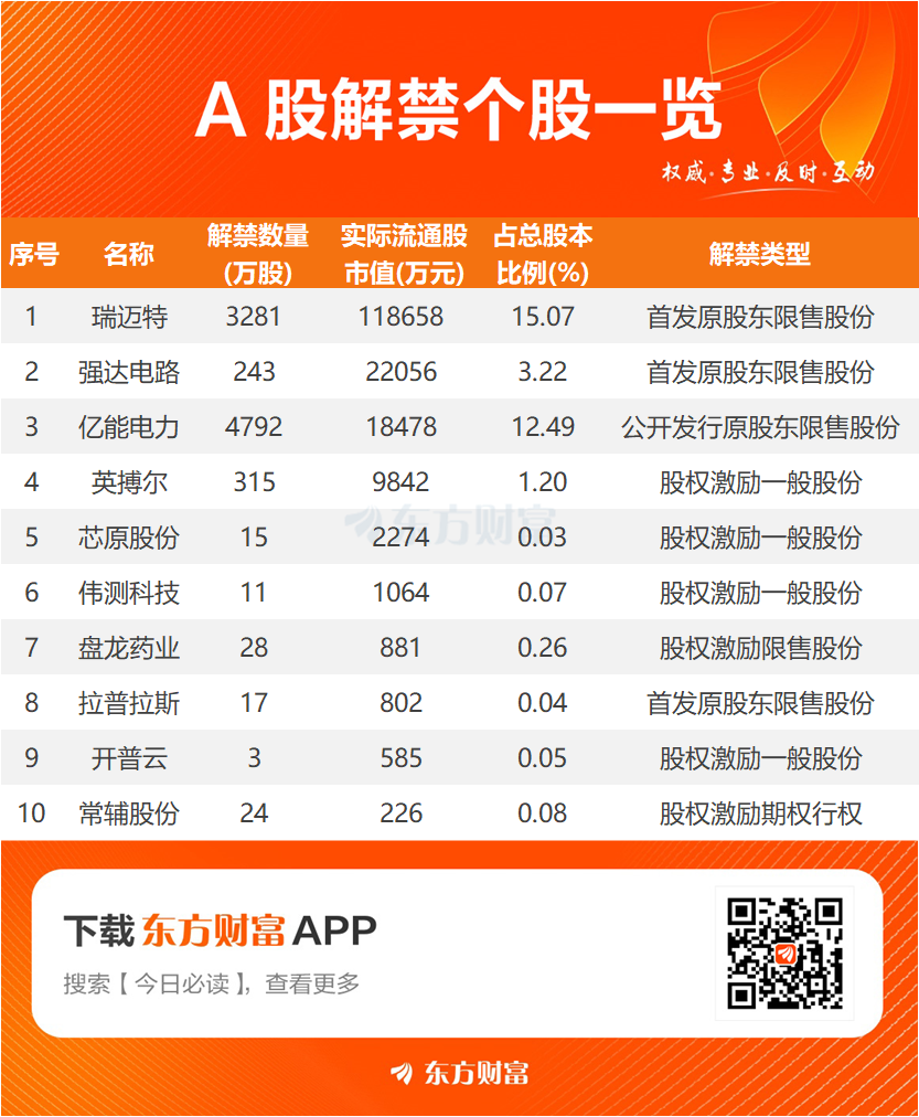 【明日解禁】明日10股解禁 瑞迈特、强达电路解禁市值居前