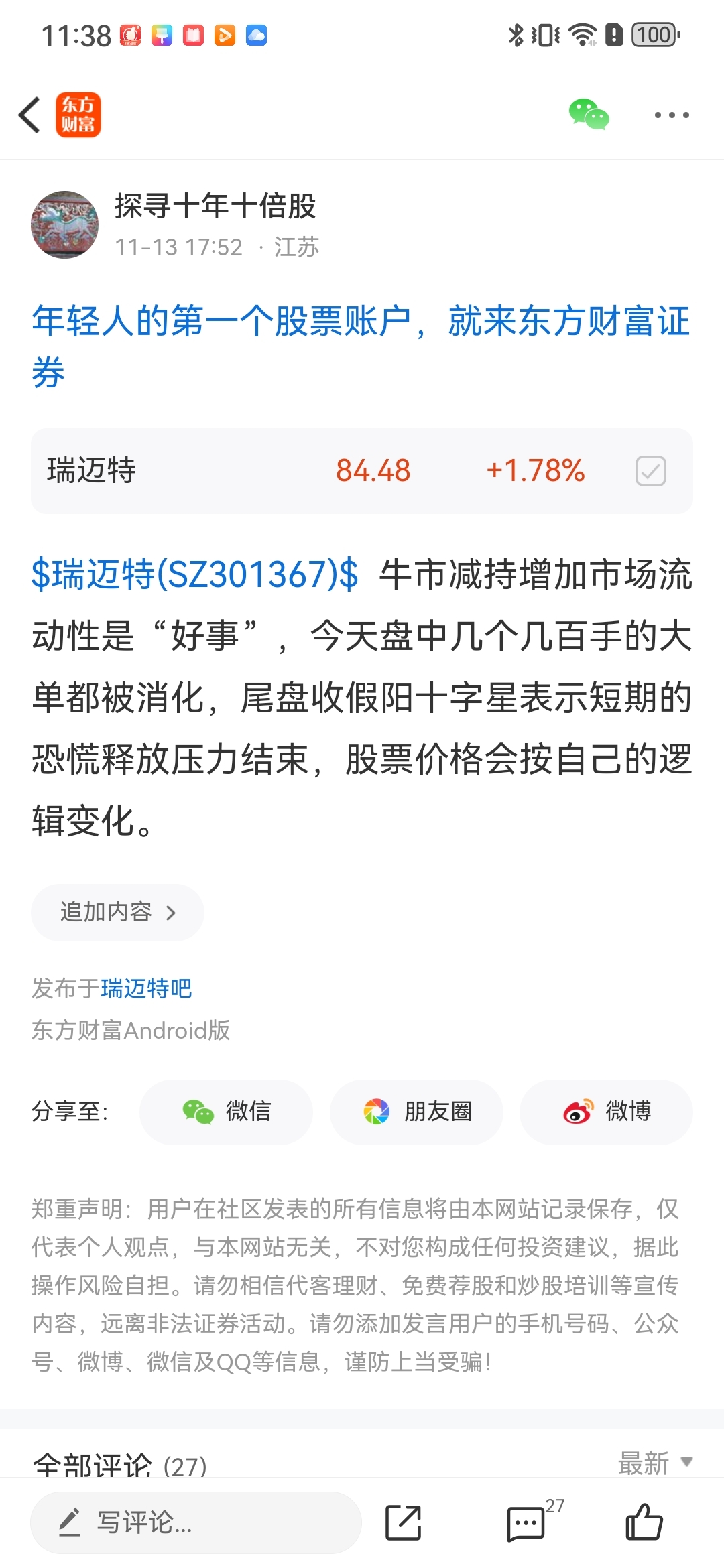 $瑞迈特(SZ301367)$ 今天的表现好很多,真的是“利空”尽股价涨。说的是一个为公司做出很大贡献的退休老人减持股票打碎“唯利是图的利己主义者”的心,你骂能骂涨?(你不会以为今天的强势是你骂出来的吧!)