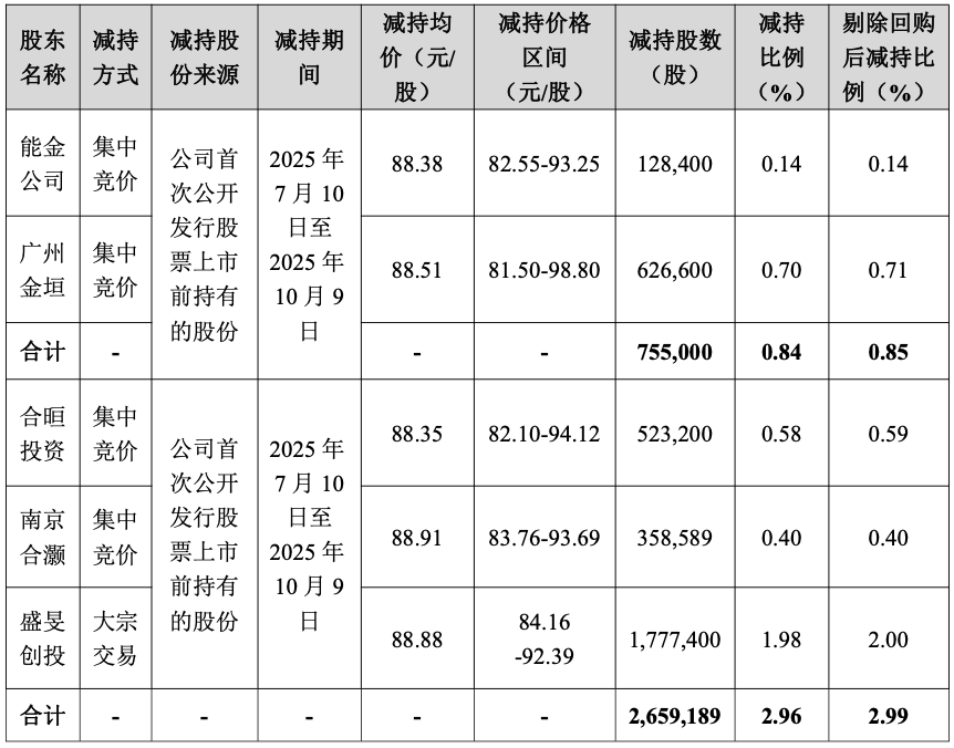 自2025年7月10日至2025年10月9日,合晅投资及其一致行动人南京合灏通过集中竞价方式减持公司股份881,789股;自2025年7月10日至2025年10月9日,盛旻创投通过大宗交易方式减持公司股份1,777,446股,合计减持股数为2,659,189股,合计持股比例由减持计划实施前的18.85%下降至15.88%,剔除回购后合计持股比例由减持计划实施前的19.00%下降至16.01%,本次减持计划届满。