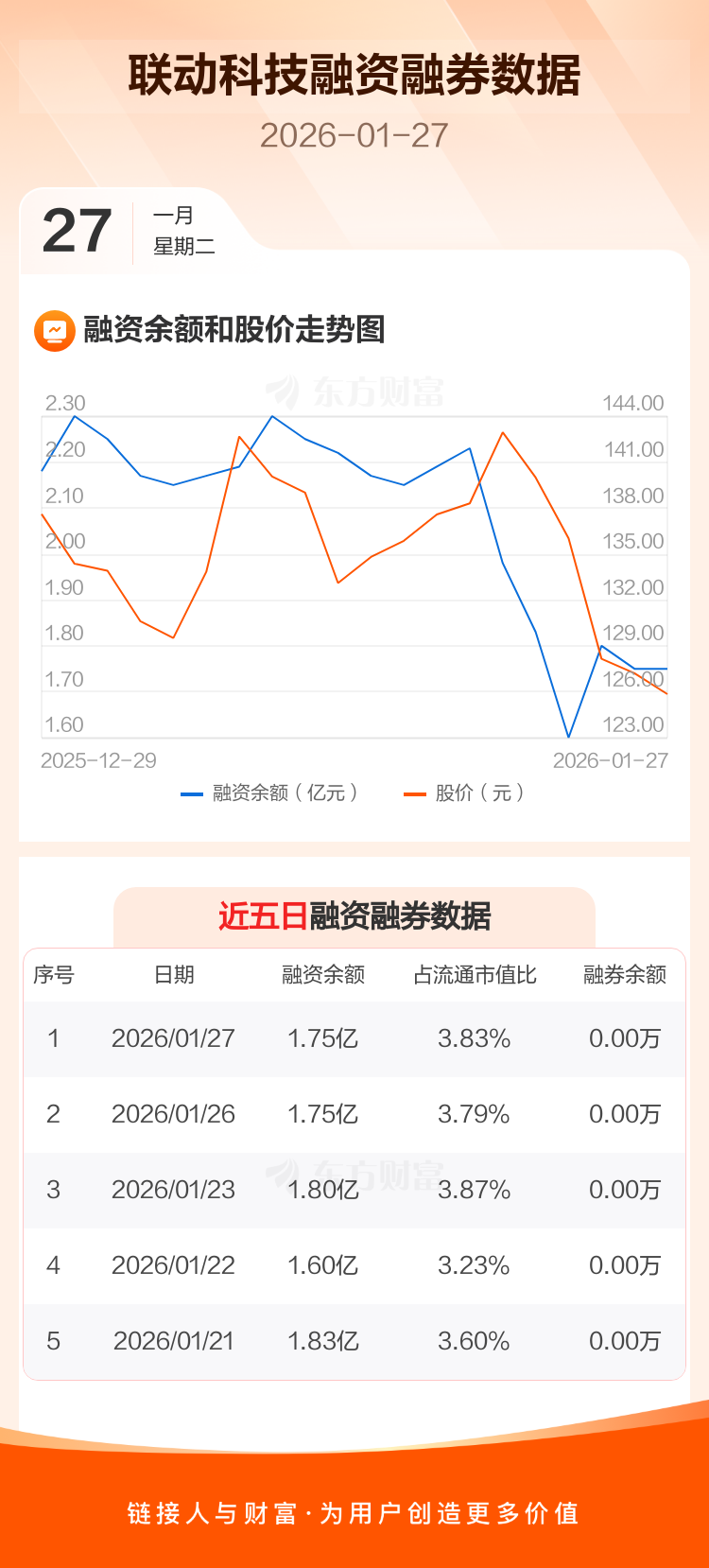 联动科技:融资净偿还5.62万元,融资余额1.75亿元