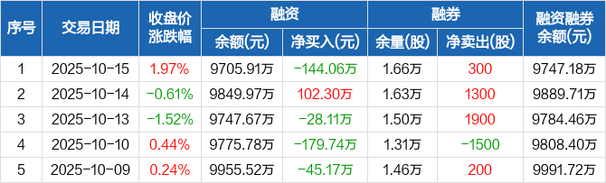 敷尔佳:融资净偿还144.06万元,融资余额9705.91万元(10-15)