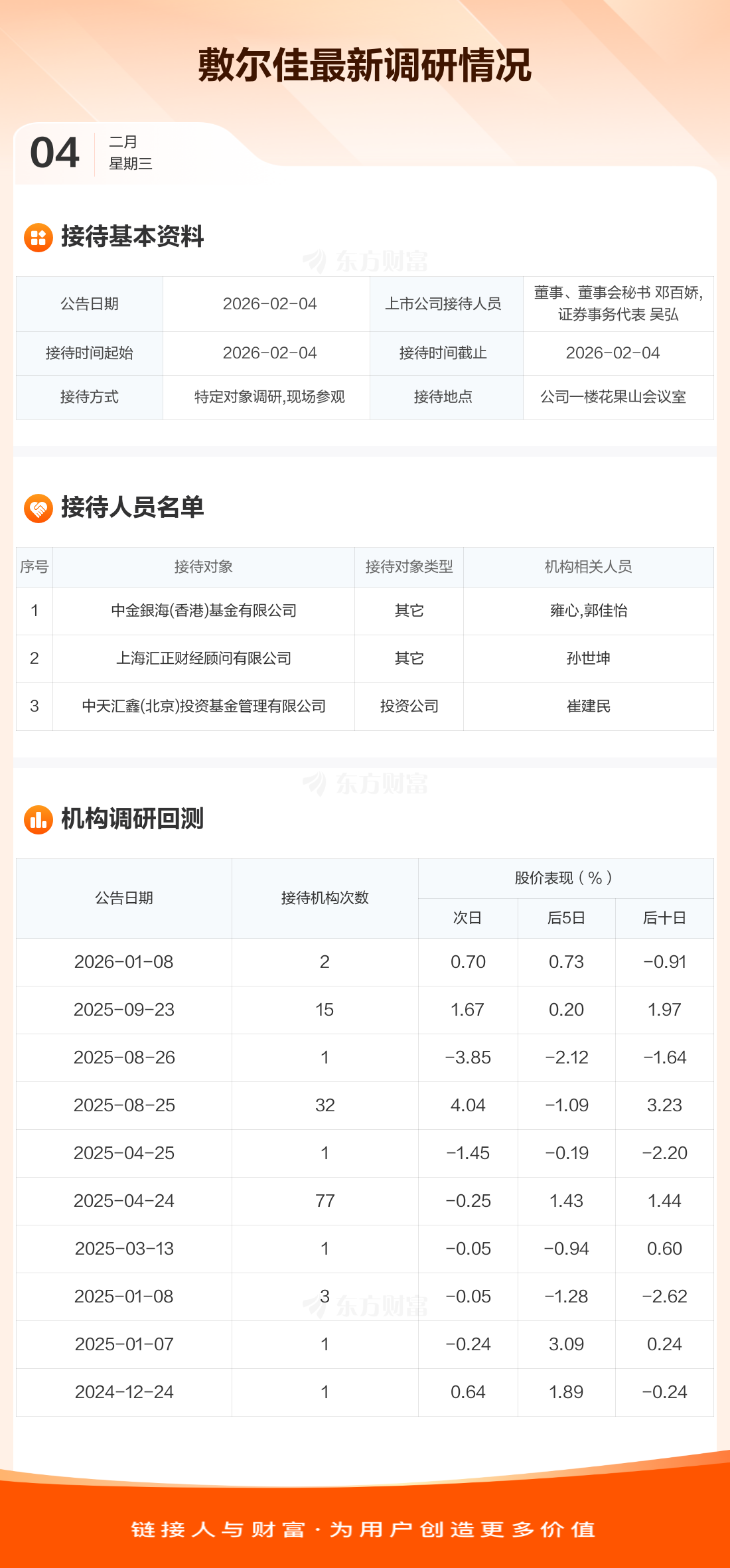 敷尔佳2月4日公告称,2月4日接待中金銀海(香港)基金有限公司等3家机构调研。接待人员包括董事、董事会秘书 邓百娇,证券事务代表 吴弘。