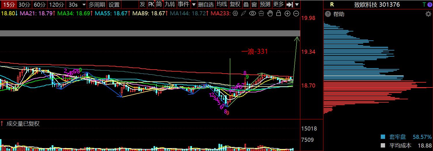 本来这周一就已经到2浪调整的末端,主力在强行拉长调整时间。今天尾盘14:30居然出现异动向下跌,18.59再加一点仓位好了,集合竞价又快速上拉。没有这个异动我还不会加仓,看明天主力如何表演吧。