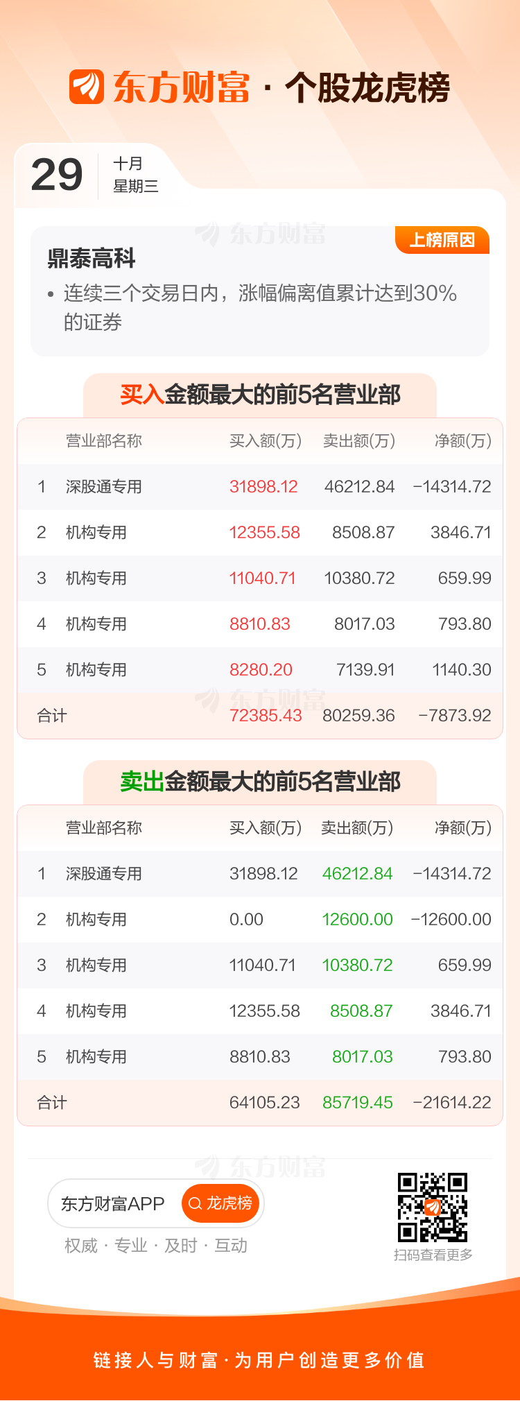 鼎泰高科(301377)龙虎榜数据(10-29)