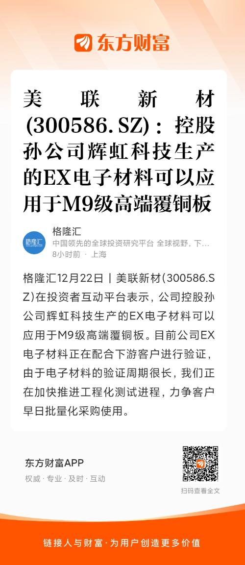 格隆汇12月22日丨美联新材(300586.SZ)在投资者互动平台表示,公司控股孙公司辉虹科技生产的EX电子材料可以应用于M9级高端覆铜板。目前公司EX电子材料正在配合下游客户进行验证,由于电子材料的验证周期很长,我们正在加快推进工程化测试进程,力争客户早日批量化采购使用。