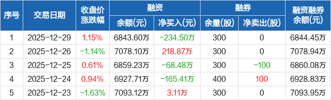 通达海:融资净偿还234.5万元,融资余额6843.6万元(12-29)