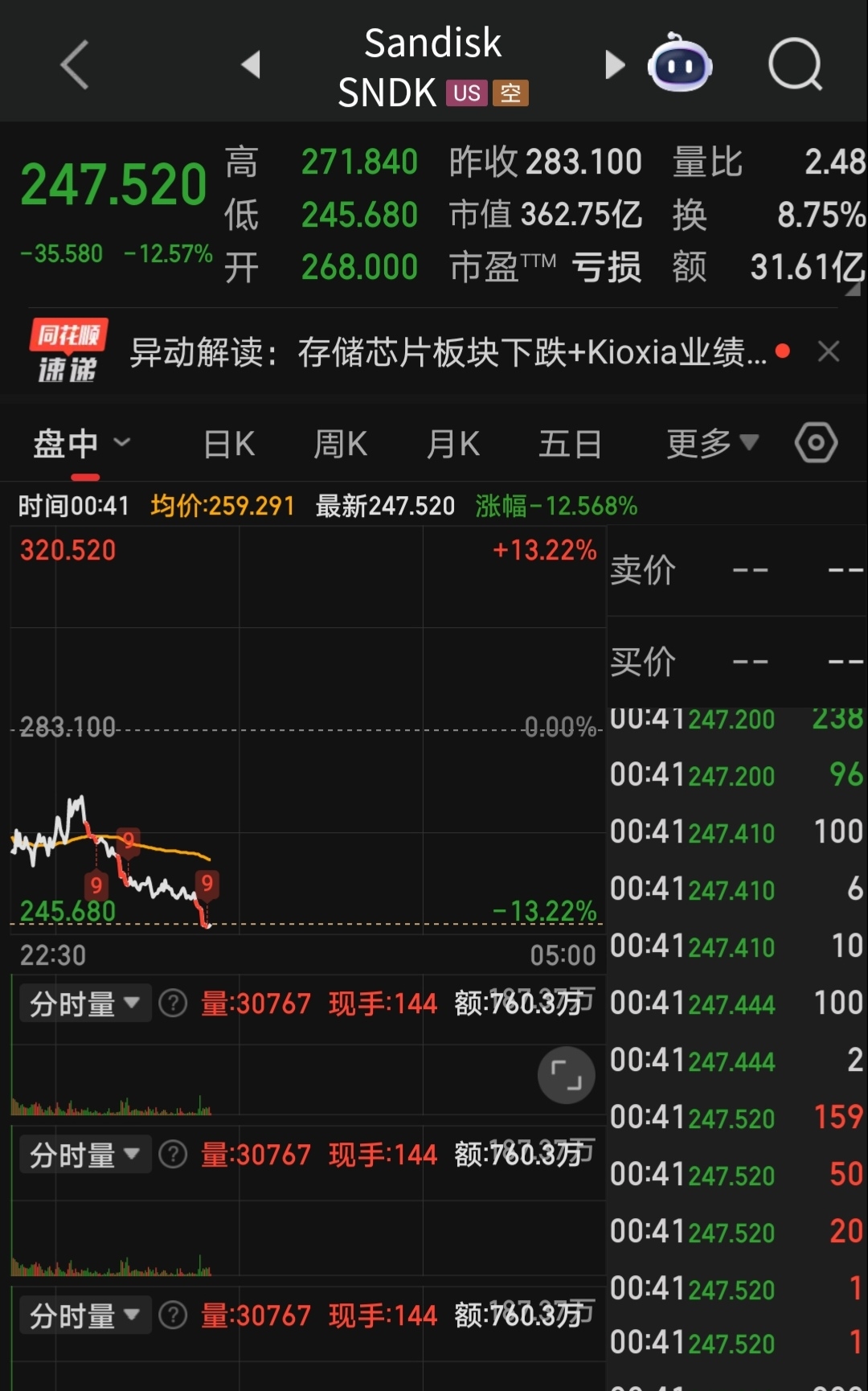 $天山电子(SZ301379)$ 美股存储芯片崩了 闪迪12个点。