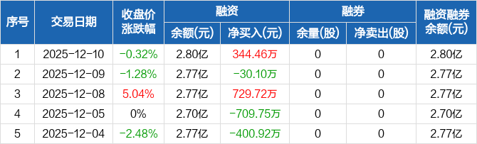 天山电子:融资净买入344.46万元,融资余额2.8亿元(12-10)