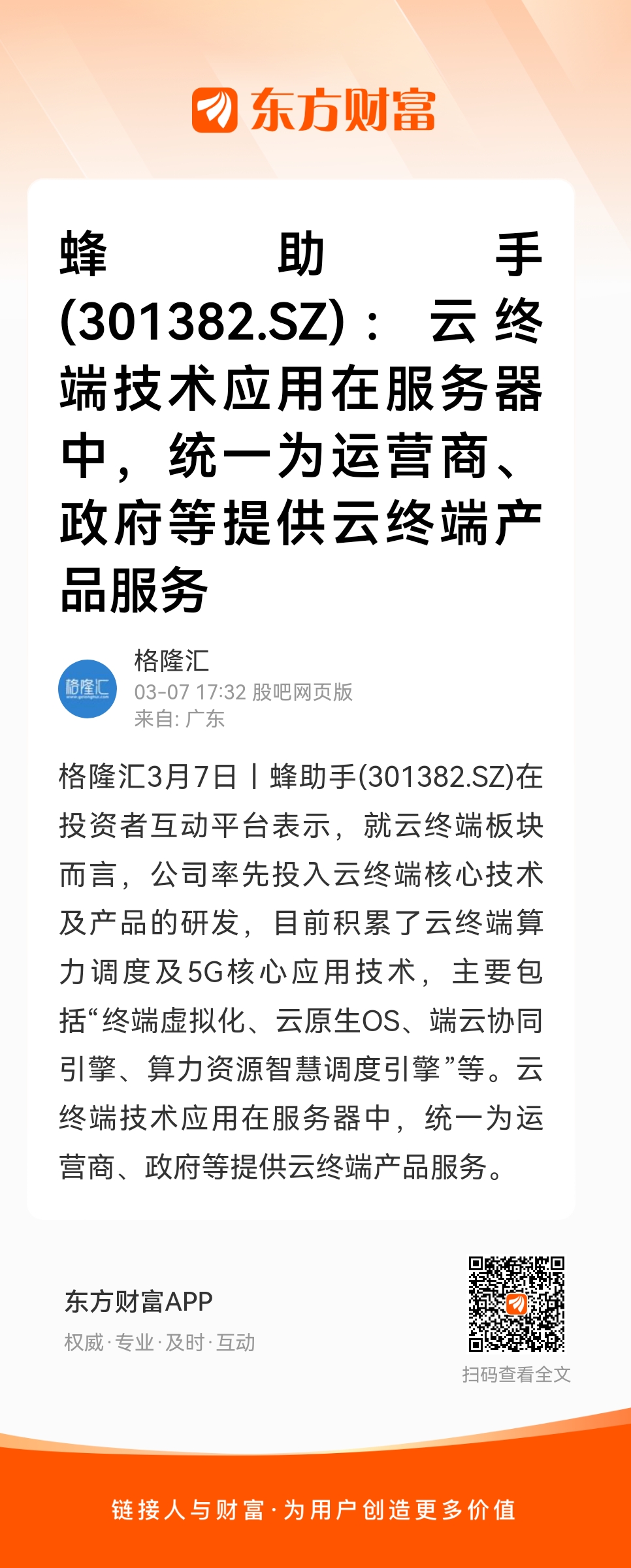 格隆汇3月7日丨蜂助手(301382.SZ)在投资者互动平台表示,就云终端板块而言,公司率先投入云终端核心技术及产品的研发,目前积累了云终端算力调度及5G核心应用技术,主要包括“终端虚拟化、云原生OS、端云协同引擎、算力资源智慧调度引擎”等。云终端技术应用在服务器中,统一为运营商、政府等提供云终端产品服务。