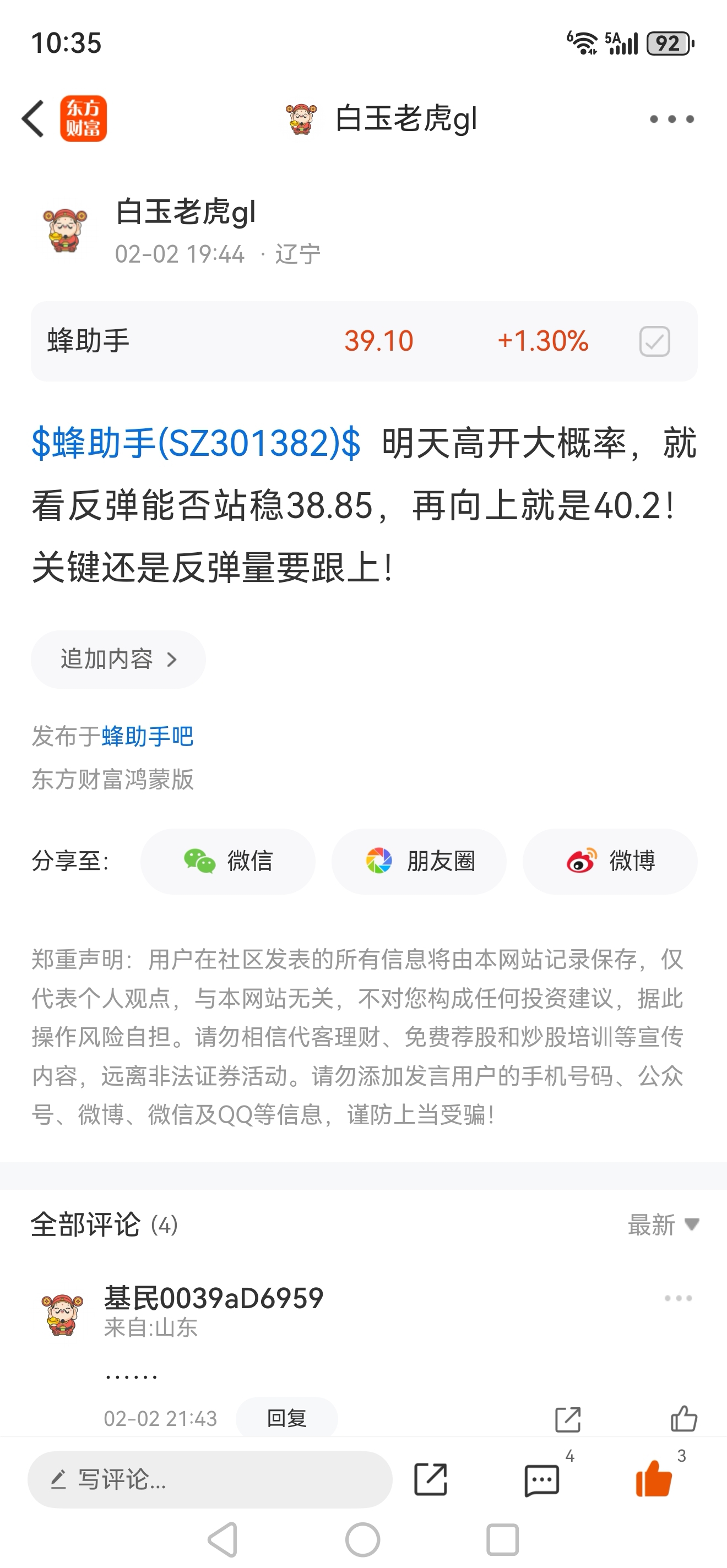 温馨提示: 1.根据《证券法》规定,禁止编造、传播虚假信息或者误导性信息,扰乱证券市场;2.用户在本社区发表的所有资料、言论等仅代表个人观点,与本网站立场无关,不对您构成任何投资建议。用户应基于自己的独立判断,自行决定证券投资并承担相应风险。《东方财富社区管理规定》