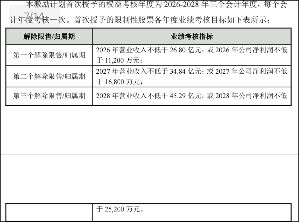 根据两张图和股权激励计划,2026年营收预计26亿,增幅38%,净利润1.1亿,