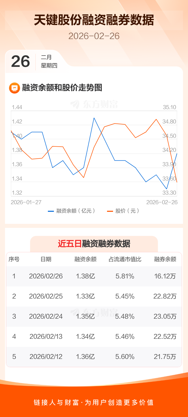交易所最新数据显示,天键股份于2026年2月26日获融资买入1259.10万元,融资偿还794.05万元,当日融资净买入465.06万元。目前,该股融资余额1.38亿,占流通市值比例为5.81%。