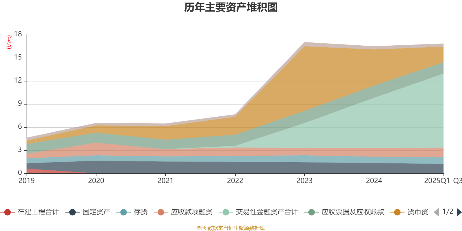 资产重大变化方面,截至2025年三季度末,公司交易性金融资产合计较上年末增加47.53%,占公司总资产比重上升17.57个百分点;货币资金较上年末减少57.09%,占公司总资产比重下降16.51个百分点;固定资产较上年末减少8.92%,占公司总资产比重下降0.87个百分点;应收票据及应收账款较上年末减少5.55%,占公司总资产比重下降0.72个百分点。