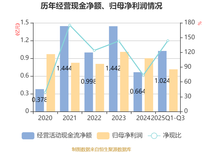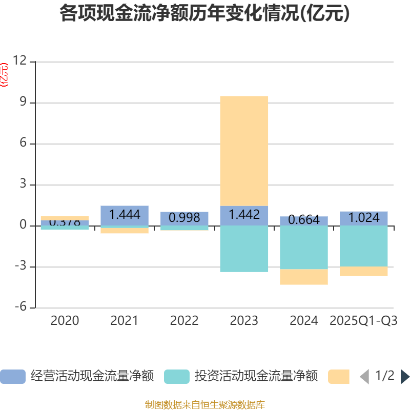 2025年前三季度,公司经营活动现金流净额为1.02亿元,同比增长162.7%;筹资活动现金流净额-7000万元,同比增加2926.8万元;投资活动现金流净额-3亿元,上年同期为-4.27亿元。