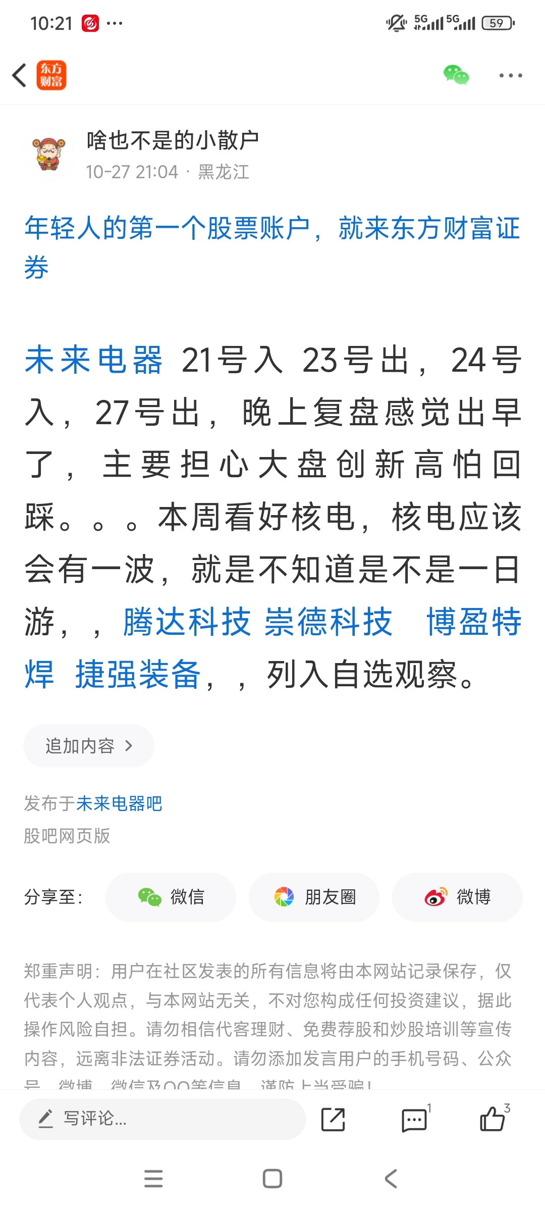 温馨提示: 1.根据《证券法》规定,禁止编造、传播虚假信息或者误导性信息,扰乱证券市场;2.用户在本社区发表的所有资料、言论等仅代表个人观点,与本网站立场无关,不对您构成任何投资建议。用户应基于自己的独立判断,自行决定证券投资并承担相应风险。《东方财富社区管理规定》