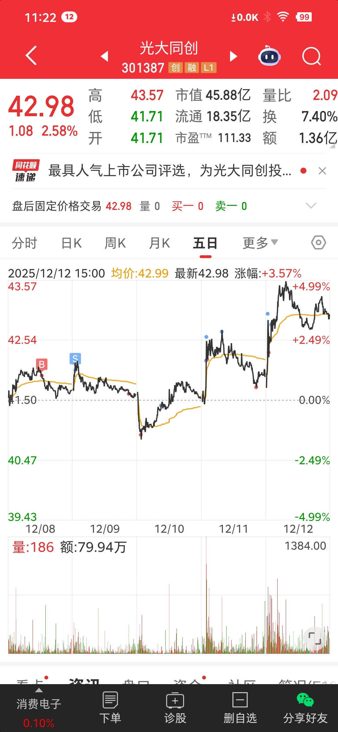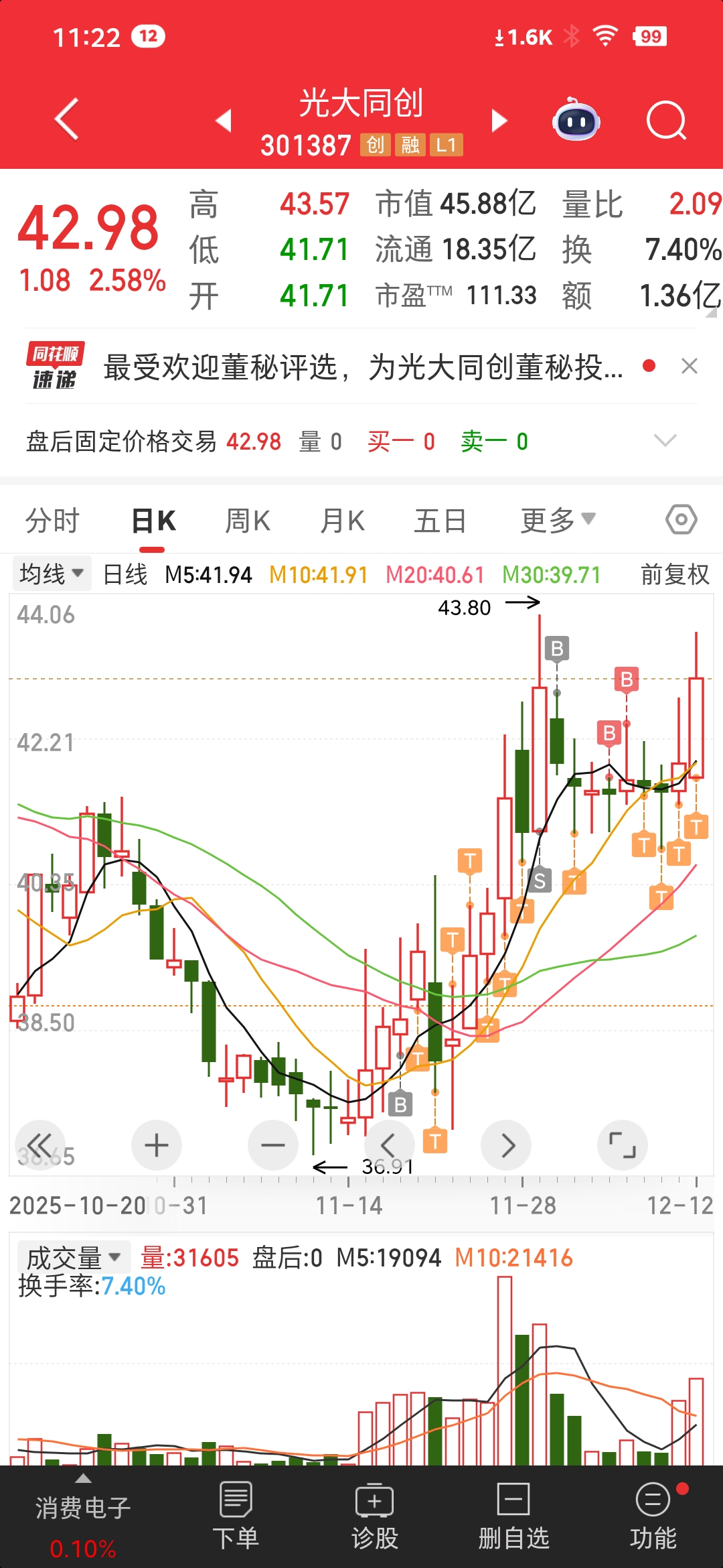 $光大同创(SZ301387)$ 明天开盘又是一周开始,如何运行?不知,复盘上周量能不够,靠周四五放量上行至43,收盘站上十月以来高点还差点,能加速吗?依光大的走势来看,难,九月平台高点44压力不小,还是得看量能与减持争夺。如能平稳运行42.5至45突破,可看高一线,小散从来不能主导,只能跟随。富贵险中求,也在险中丢,恐惧与贪婪对应的赢与亏,总成比例。是票有风险,选择适合自己的操作,自控。