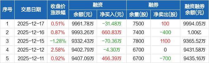 光大同创:融资净偿还31.48万元,融资余额9961.78万元(12-17)