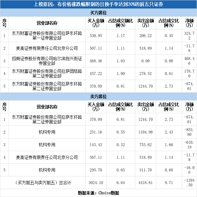 龙虎榜数据显示,今日共3个机构席位出现在龙虎榜单上,分别位列卖二、卖三、卖五,合计净卖出1479.99万元,占龙虎榜净卖额的106.13%。