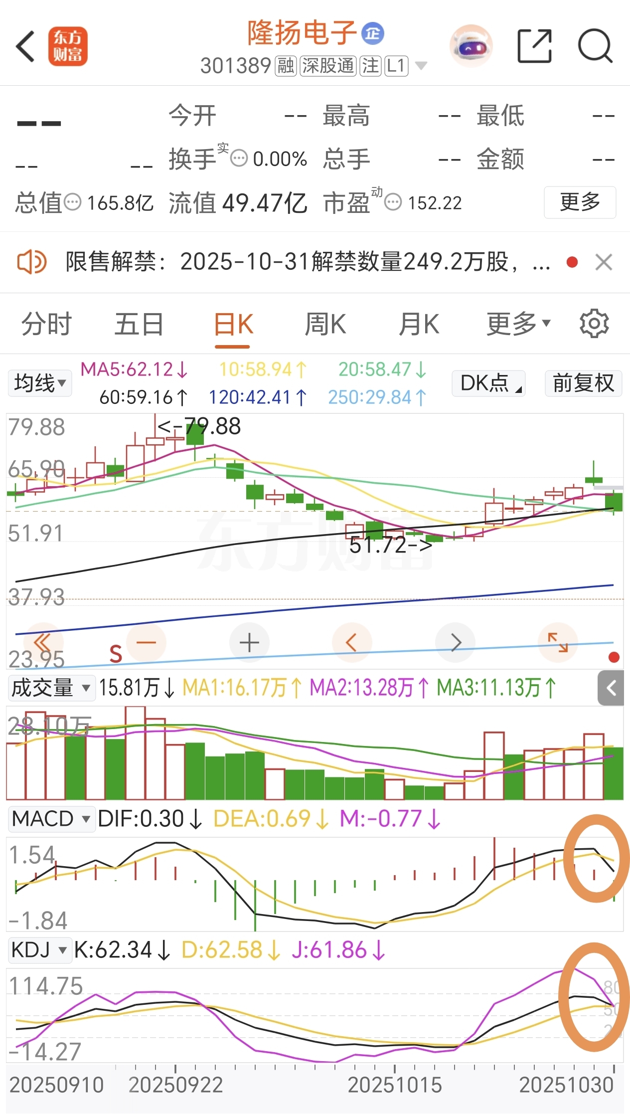 $隆扬电子(SZ301389)$ 周五走势预测:MACD死叉,KDJ死叉,今天将会是低开低走的一天。下方20日线是最后的支撑,如果跌破,将迎来下跌修复行情。操作思路:在车上的散户适当减仓,在场外的散户莫着急进场,被套的散户要么割肉要么硬抗。