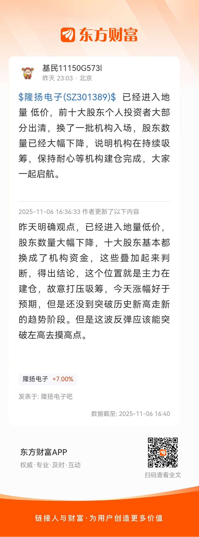 $隆扬电子(SZ301389)$ 已经进入地量 低价,前十大股东个人投资者大部分出清,换了一批机构入场,股东数量已经大幅下降,说明机构在持续吸筹,保持耐心等机构建仓完成,大家一起启航。