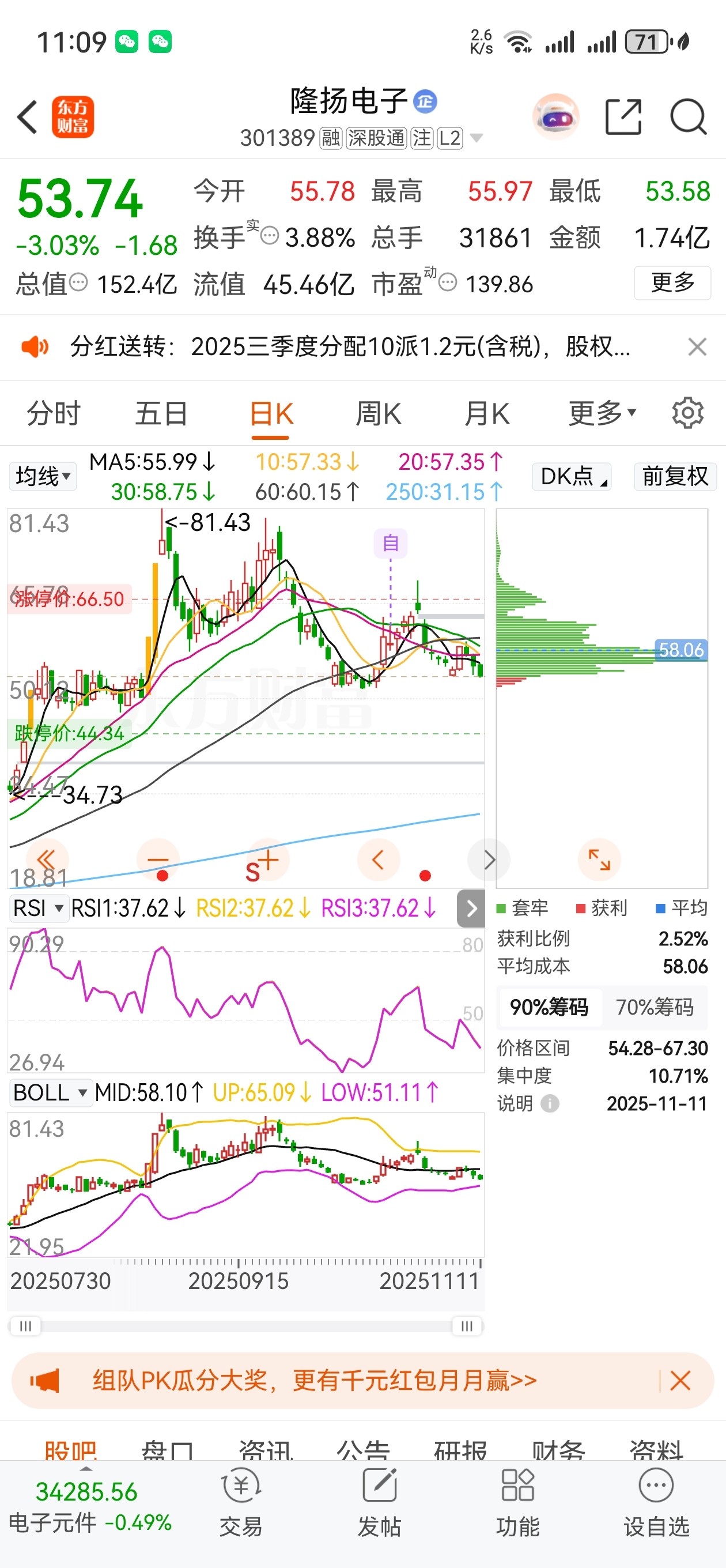 $隆扬电子(SZ301389)$ 平均成本继续下降!盈利比例不足3%,集中度来到6左右就差不多起飞了!估计还要震荡到月底!