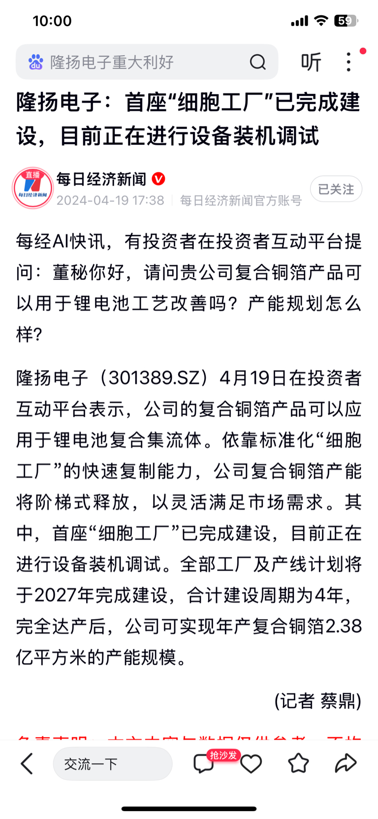 $隆扬电子(SZ301389)$ 从2024年四月第一座细胞工厂建设完成!装机中!到2025年12月了!还在装机中?
