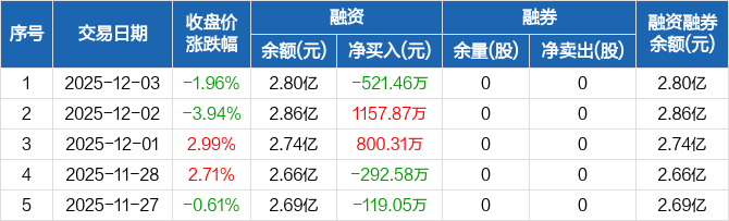 汇成真空:融资净偿还521.46万元,融资余额2.8亿元(12-03)
