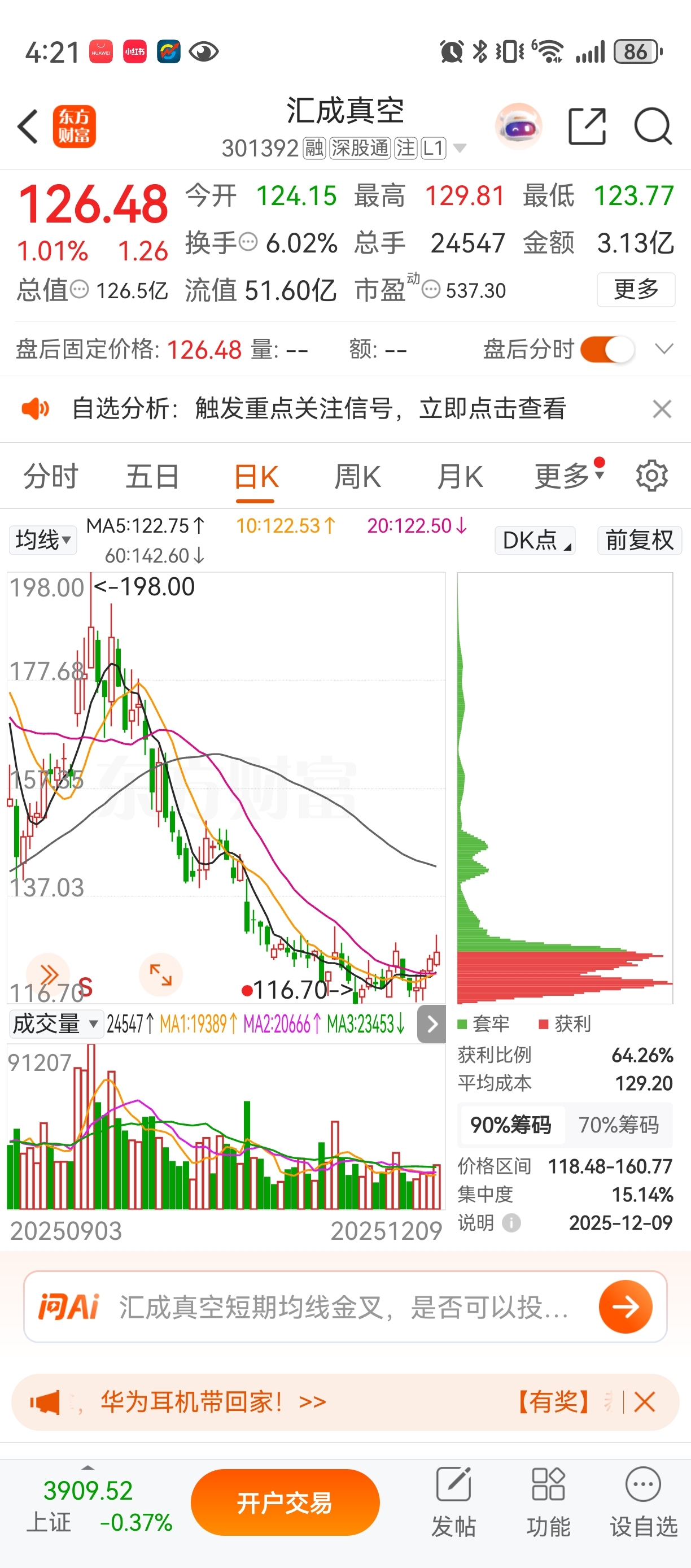$汇成真空(SZ301392)$ 平均成本129.20,kao,任重道远,对我这154成本来说,还是看好这的,不过不较劲了,爱咋咋地