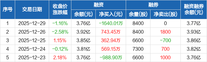 汇成真空:融资净偿还1640.01万元,融资余额3.76亿元(12-29)