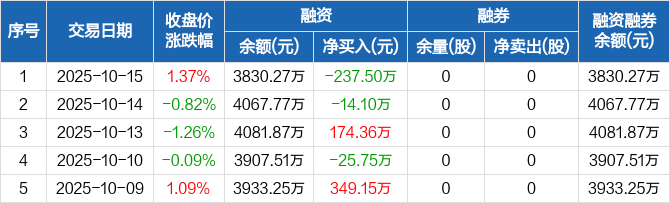 仁信新材:融资净偿还237.5万元,融资余额3830.27万元(10-15)