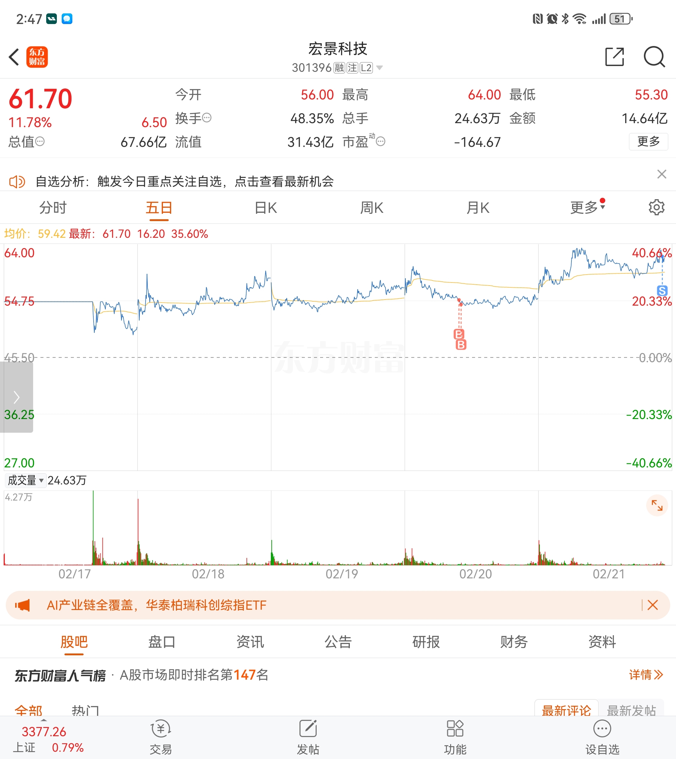$宏景科技(SZ301396)$ 一日游54.5入 62.5出 不贪心了 这风险太大 祝留下的兄弟长红