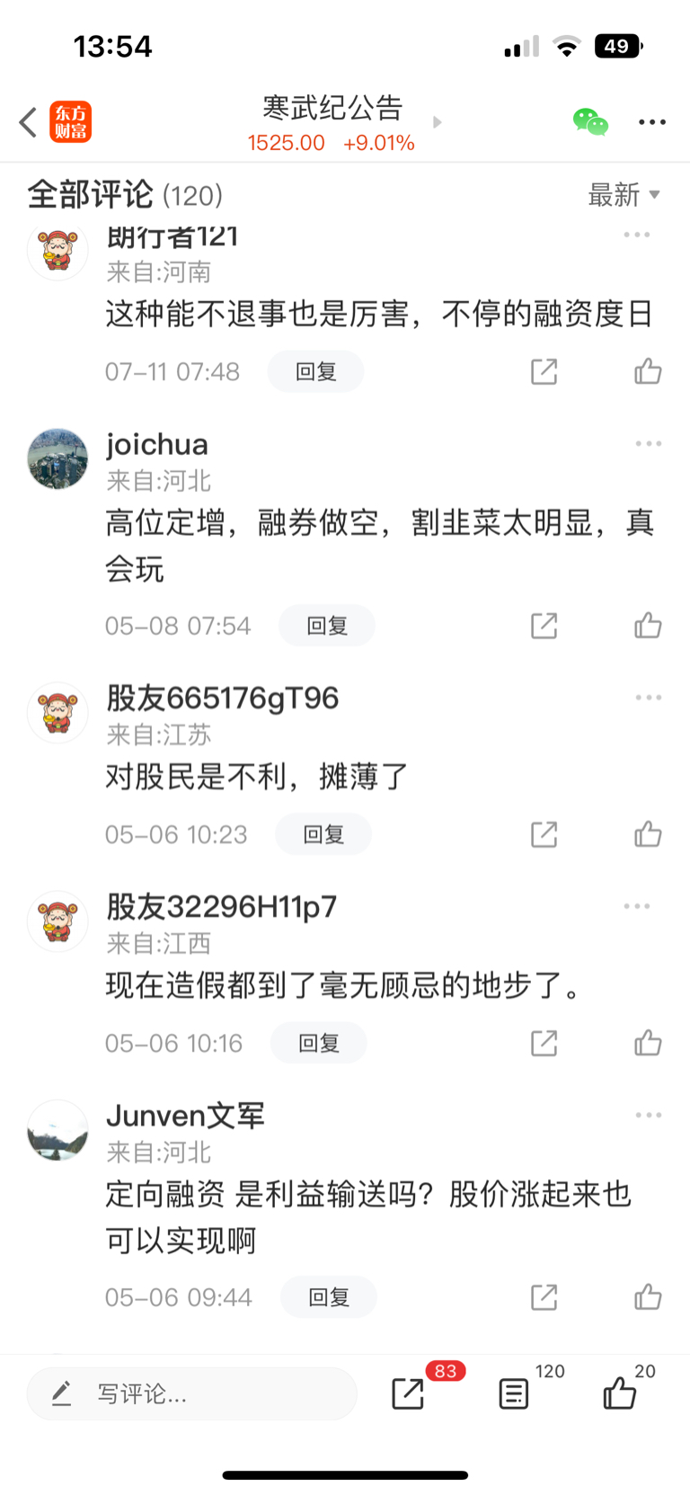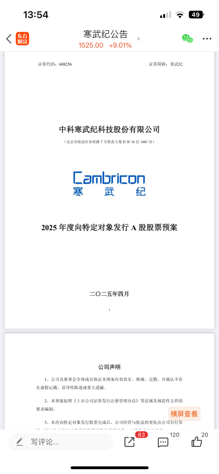 有空去看看今年五月份寒武纪的定增公告,以及股吧里面的评论。那时候寒武纪股价600
