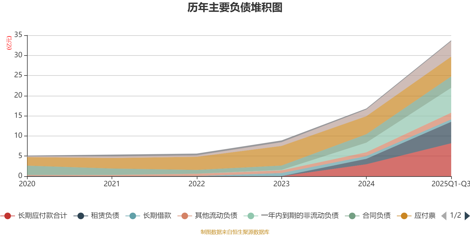 负债重大变化方面,截至2025年三季度末,公司长期应付款合计较上年末增加175.62%,占公司总资产比重上升7.23个百分点;租赁负债较上年末增加295.64%,占公司总资产比重上升6.73个百分点;应付票据及应付账款较上年末增加9.94%,占公司总资产比重下降5个百分点;一年内到期的非流动负债较上年末增加159.24%,占公司总资产比重上升4.96个百分点。