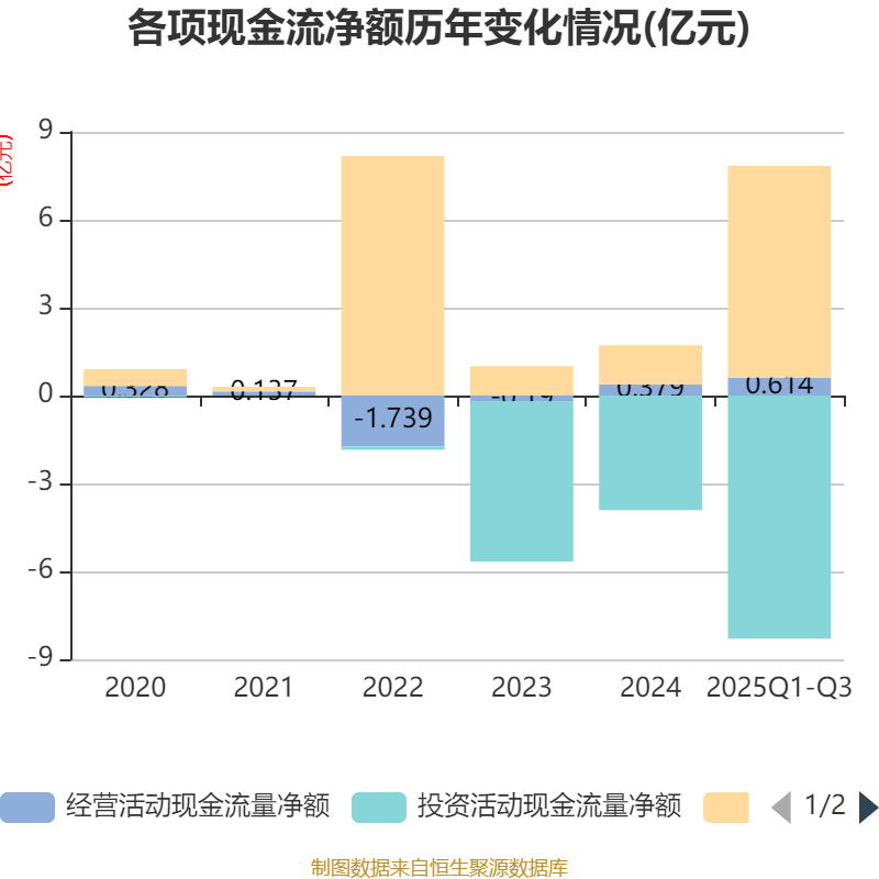 2025年前三季度,公司经营活动现金流净额为6139.03万元,同比增加4.49亿元;筹资活动现金流净额7.22亿元,同比增加6.96亿元;投资活动现金流净额-8.3亿元,上年同期为3.13亿元。