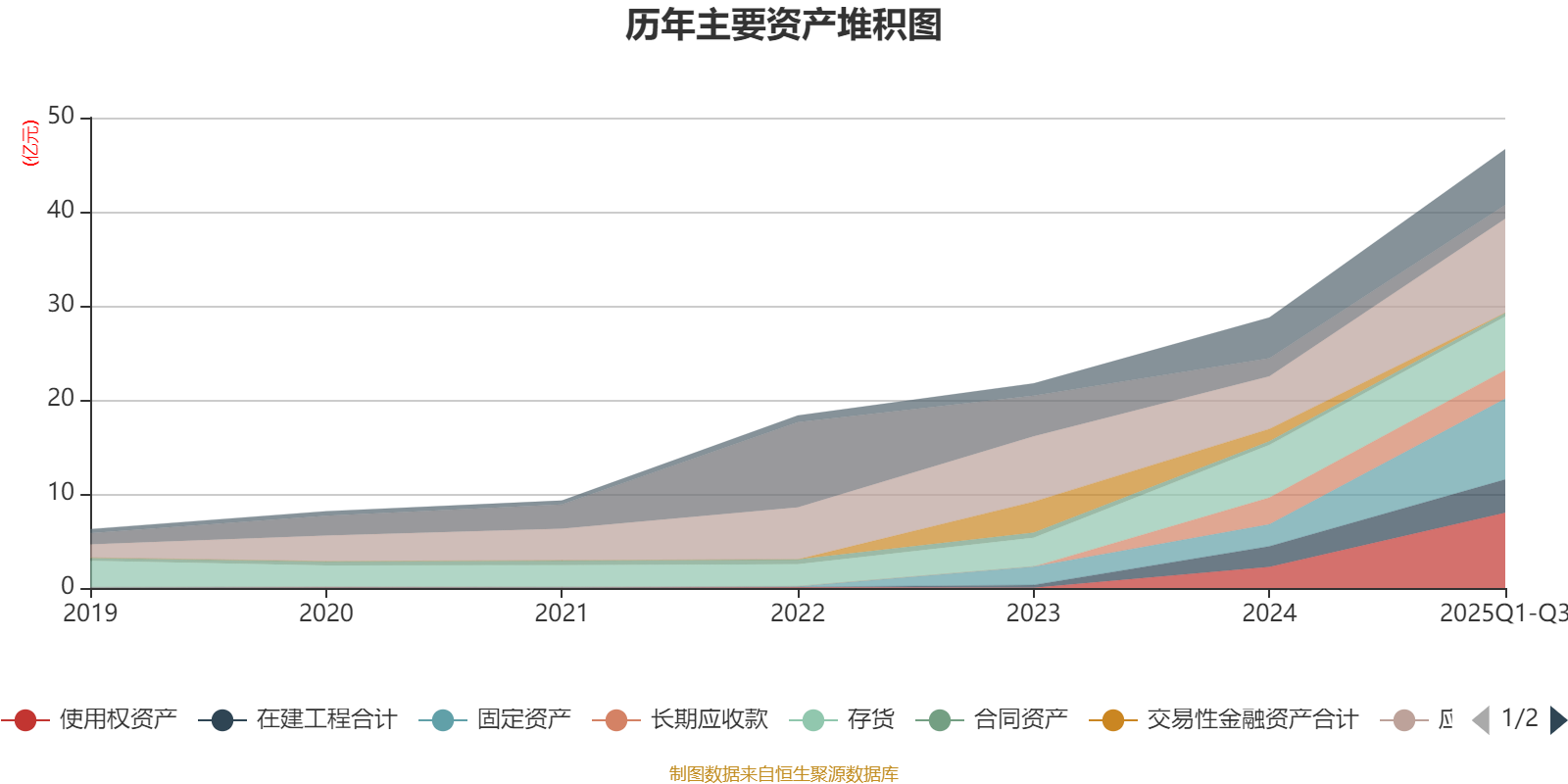 资产重大变化方面,截至2025年三季度末,公司固定资产较上年末增加266.38%,占公司总资产比重上升10.26个百分点;使用权资产较上年末增加257.18%,占公司总资产比重上升9.36个百分点;存货较上年末增加2.09%,占公司总资产比重下降7.2个百分点;交易性金融资产合计较上年末减少100%,占公司总资产比重下降4.56个百分点。
