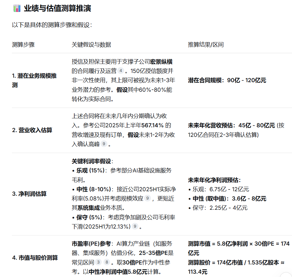 根据大股东无偿提供担保及共同授信150亿元担保的业绩及估值测算
