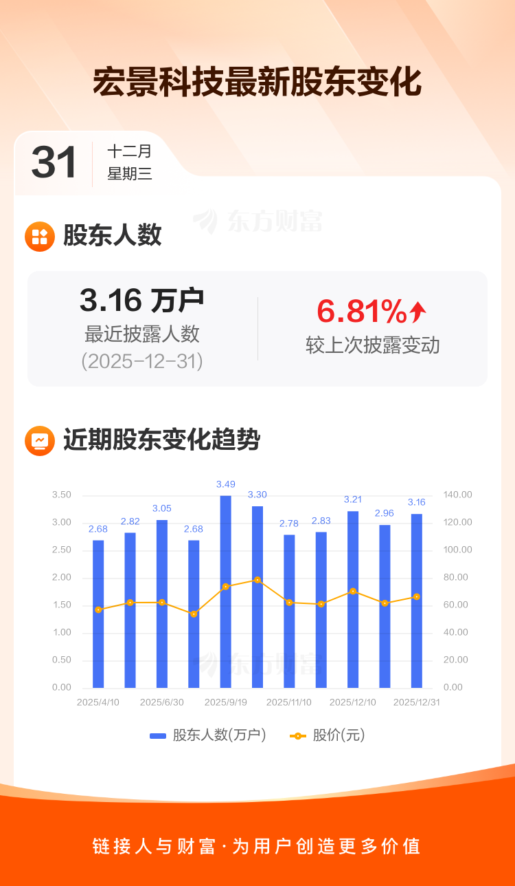 宏景科技最新披露数据显示,截至12月31日公司股东户数为3.16万户,较上期(2025年12月19日)增加2014户,增幅为6.81%。户均持有流通股数量由上期的2572股下降至2408股,户均持股金额由上期的15.82万元增加至15.97万元。