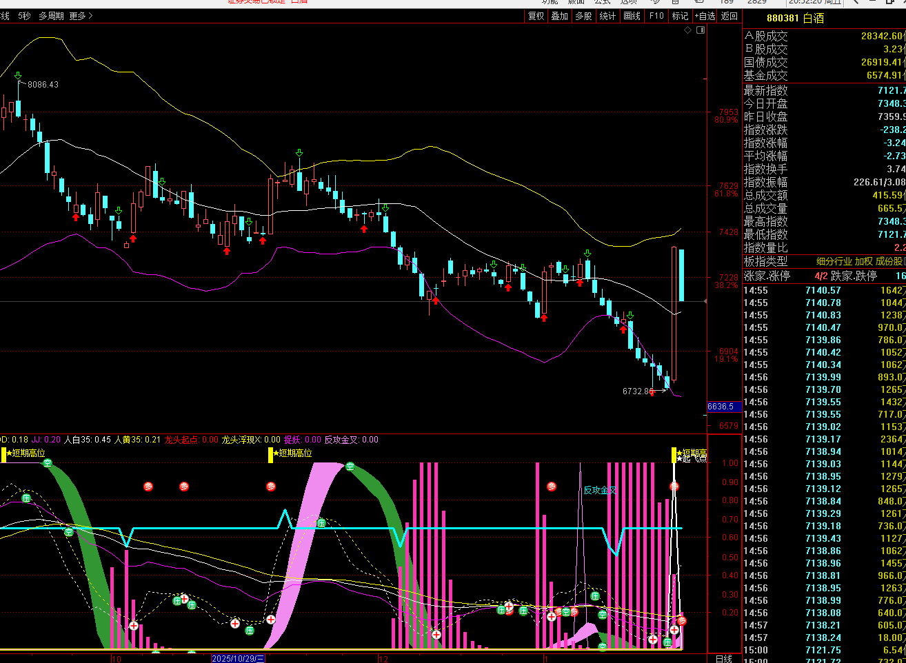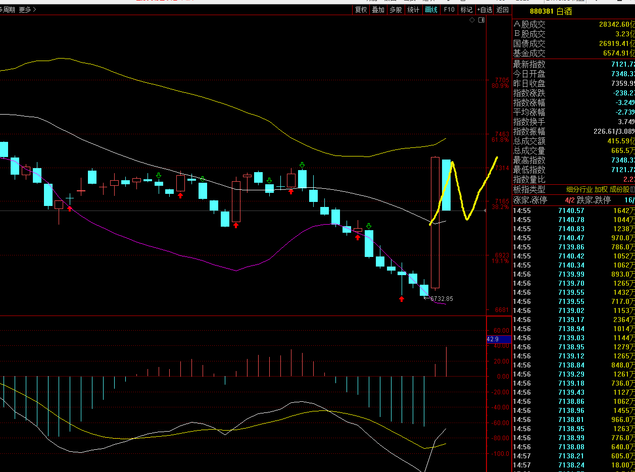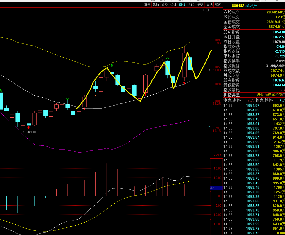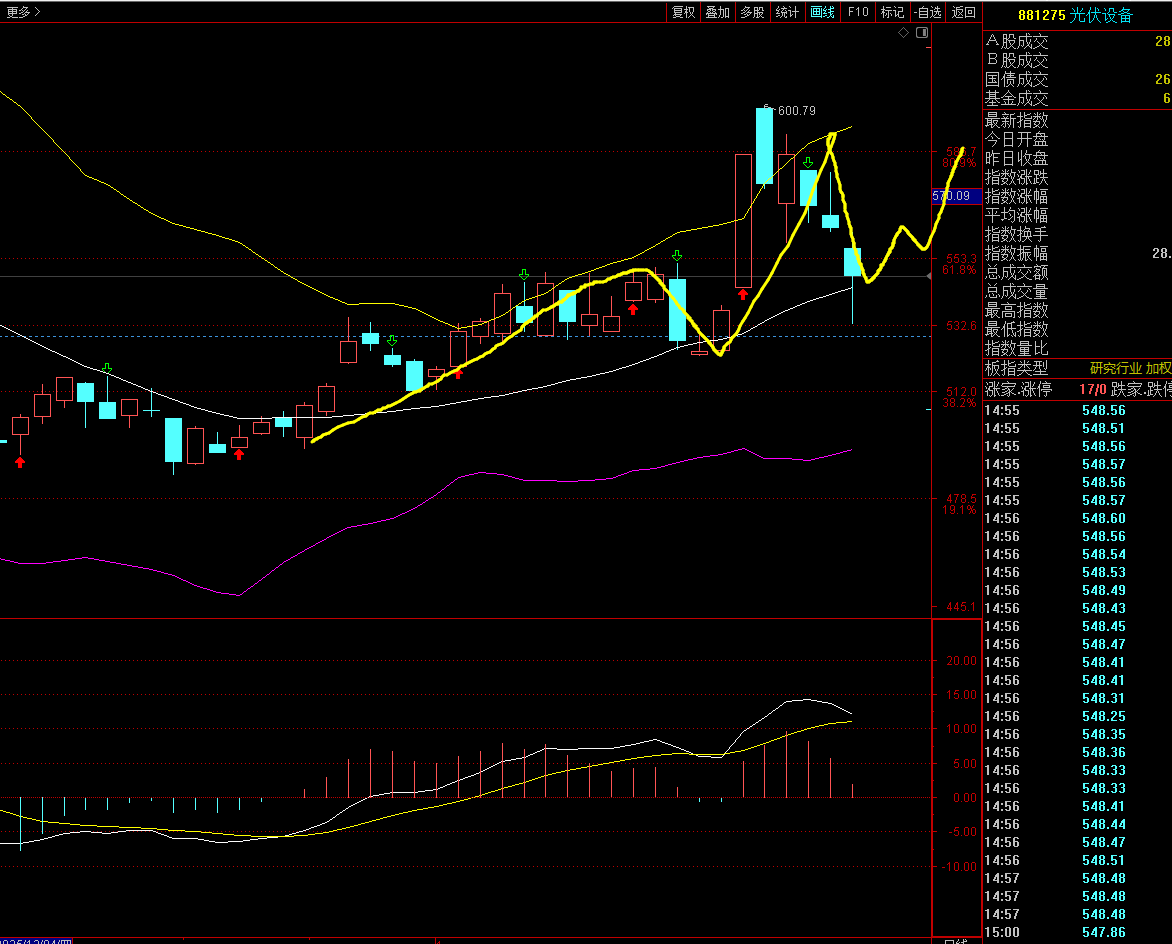 白酒板块的昨天大面积涨停个人认为就是超跌反弹,房地产依然我是看多的,今天房地产的回调依然是看正常回调,光伏设备今天的回调也是正常回调,没有多大的问题收盘都在布林线的中轨上方。